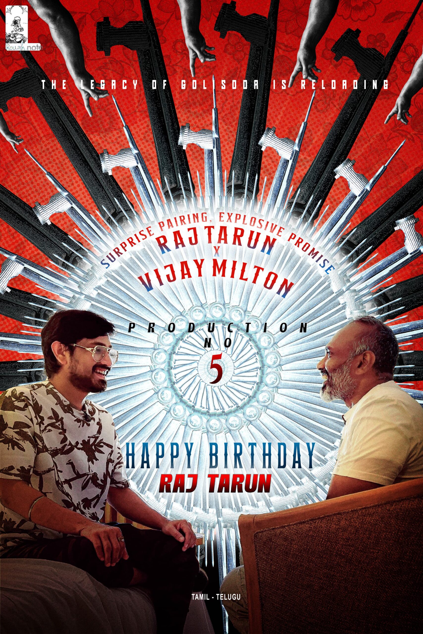 Rough Note Production, known for delivering content-driven cinema that resonates with audiences and critics alike, is proud to announce its next project, tentatively titled Production No.5. This upcoming bilingual film will be helmed by the acclaimed filmmaker and cinematographer Vijay Milton, and marks the Kollywood debut of Tollywood sensation Raj Tarun.