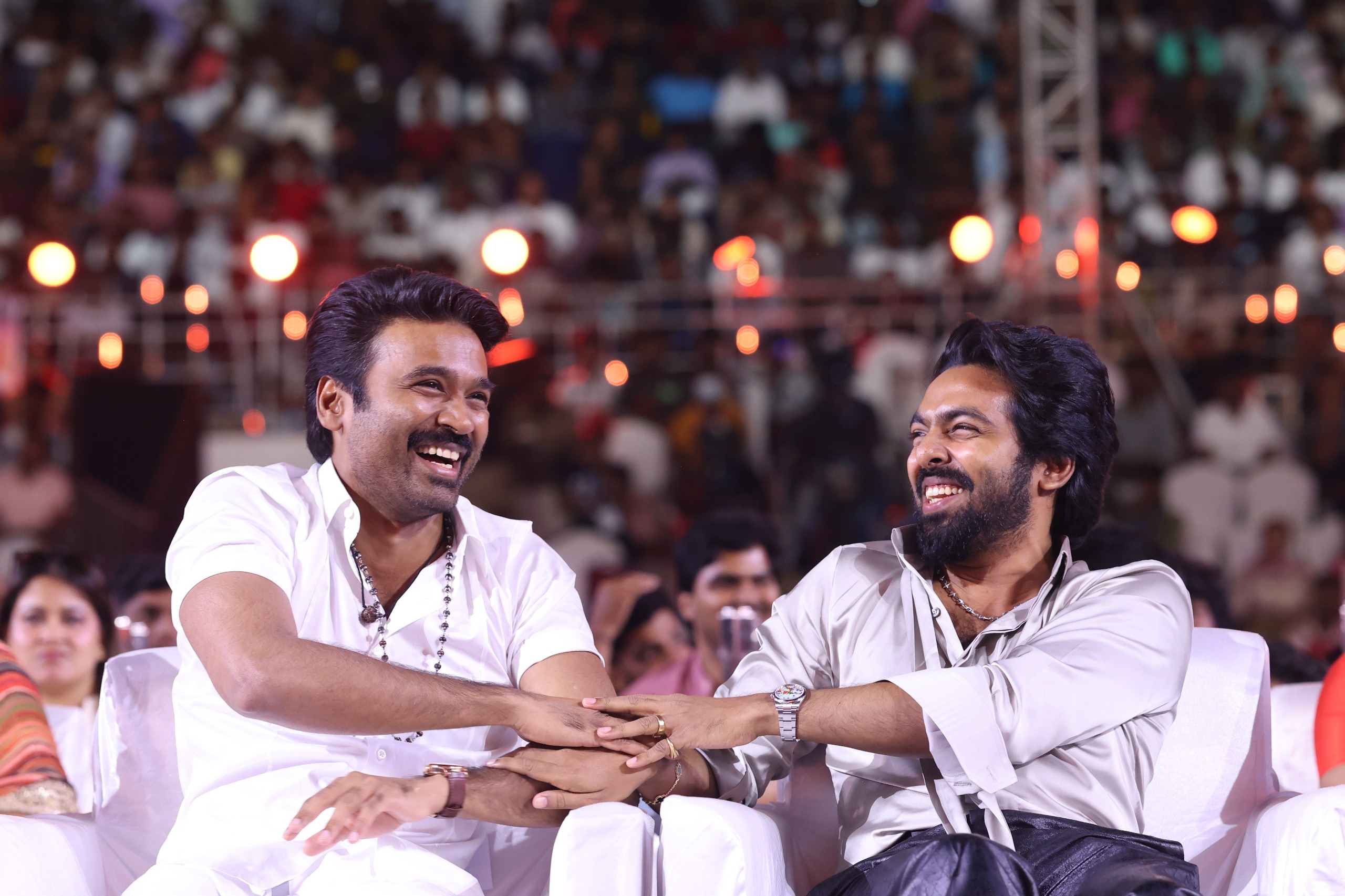 Hello to my dear friend director-actor Dhanush and to him and to the Dhanush fans who keep this stadium in a state of excitement. One king in one town. He has two princes—one in a thousand One, the other is one in ten thousand. If given any opportunity, the one who excels in it is this young Dhanush. I envy both of them in Yatra and Lingaa. When I was talking to Dhanush sir during dubbing, I looked at the phone he was holding and said, “Can I give you my phone number?” He said, “This is for talking to my kids only.”