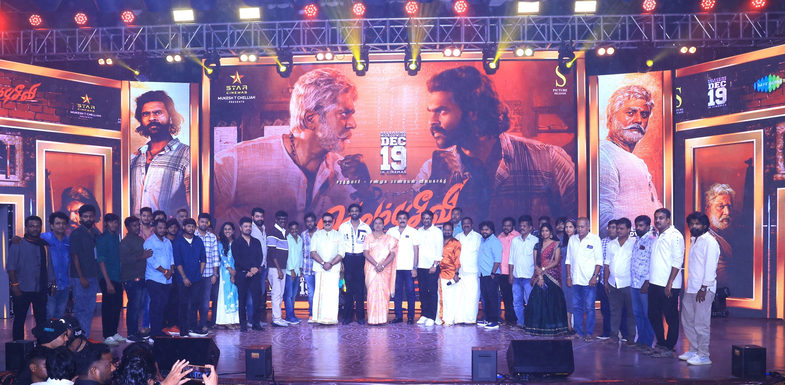 The music launch ceremony of the film, which is set to release worldwide in theaters on the 19th of this month, was held magnificently in Chennai. Many dignitaries attended the event, including the General Secretary of the Desiya Murpokku Dravida Kazhagam, Mrs. Premalatha Vijayakanth, L. K. Sudheesh, Vijay Prabhakaran, directors S. A. Chandrasekhar, M. Rajesh, Mithran R. Jawahar, actor Rio, lead actors Sarathkumar and Shanmuga Pandian Vijayakanth, music director Yuvan Shankar Raja, cinematographer Balasubramaniam, art director Saravanan Abiraman, editor Dinesh Ponraj, actor Kalki Raja, producer Mukesh T. Sellaiya, and director Ponram.