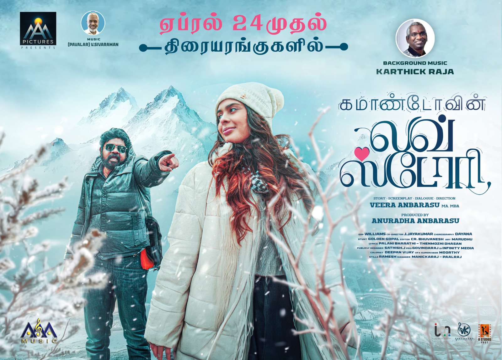 Produced by Anuradha Anbarasu under the banner of AAA Pictures, “Commando’s Love Story” is a feature film starring Veera Anbarasu as the protagonist; he has also written the story, screenplay, and dialogues, in addition to directing the film. Mumbai-based beauty Angel makes her debut as the female lead. The cast features Robo Shankar, Babloo Prithviraj, Perarasu, Aravindaraj, Vaazhai Janaki, Madhumitha, Vijay TV Mullai, Pudupettai Sakthivel, Chiranjeevi, Supergood Subramani, Boys Rajan, O.A.K. Sundar, Duraipandian, Sridevi, Poornima, Sushmita, and Nisha, alongside the debutant Akash Muthu.