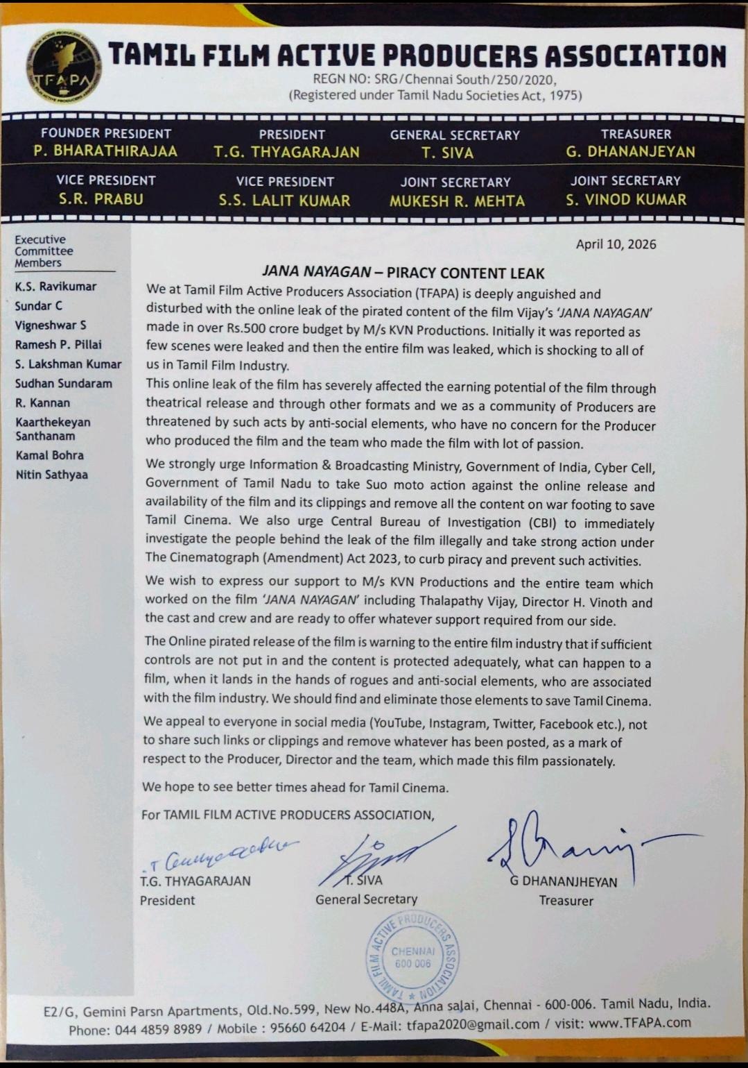 We at Tamil Film Active Producers Association (TFAPA) is deeply anguished and disturbed with the online leak of the pirated content of the film Vijay’s ‘JANA NAYAGAN’ made in over Rs.500 crore budget by M/s KVN Productions. Initially it was reported as few scenes were leaked and then the entire film was leaked, which is shocking to all of us in Tamil Film Industry.